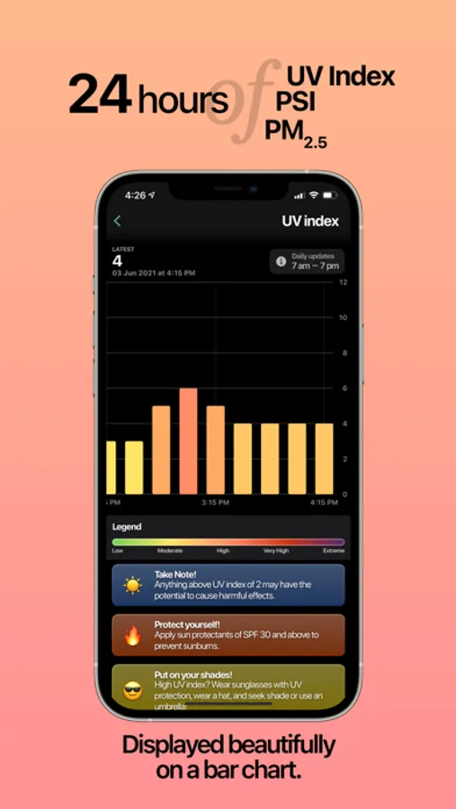 View the past 24 hours of PSI, PM2.5 and UV indexes, presented to you on a bar chart.