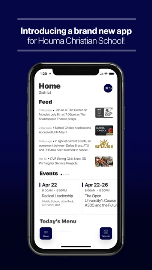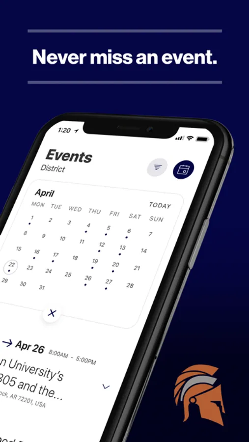 The event section shows a list of events throughout the school. Users can add an event to your calendar to share the event with friends and family with one tap.