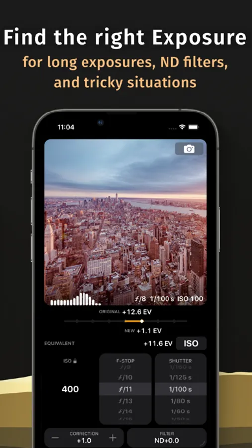 light&depth also includes a light meter and exposure calculator that makes manual exposure simpler than ever before. Find the optimal exposure immediately. Enter custom exposure corrections and ND-Filters. Calculate equivalent exposures, and see how you can adapt your exposure.