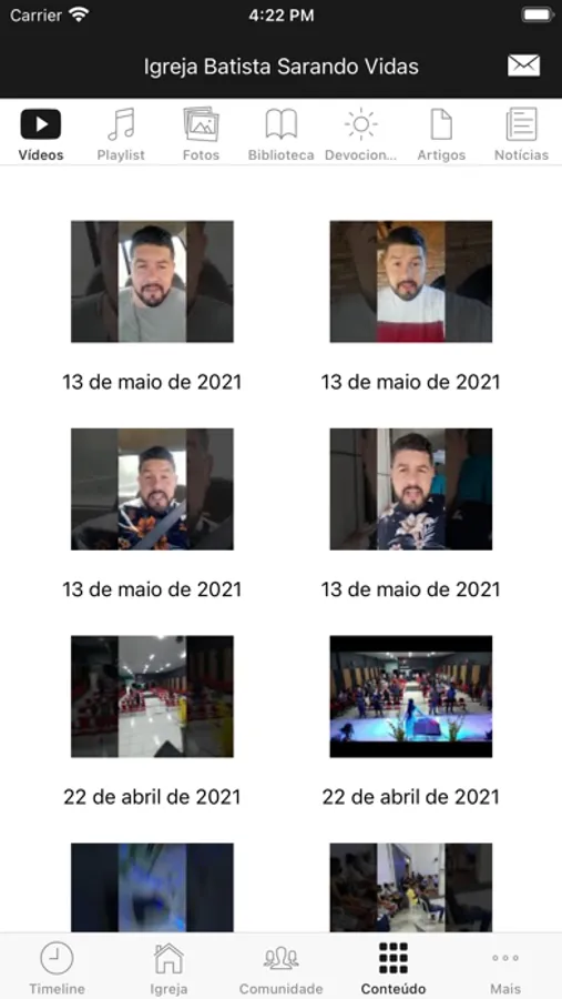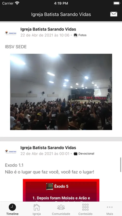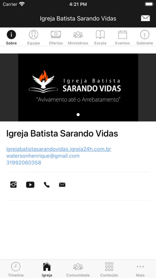 - Informações da Igreja (endereço, telefone, site, redes sociais, pastores)
