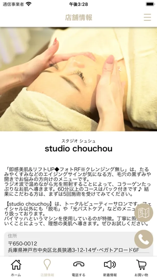 店舗のマップが表示され、地図アプリとも連携しているので、初めてのご来店の時も簡単に見つけることができます。