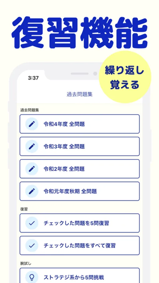 ・分からなかった過去問や難しかった問題は復習チェックをすることで、簡単にあとから復習もできます!