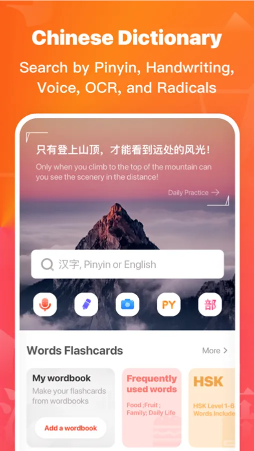 ● Search and translate by Pinyin, voice, camera (OCR), Radical, hanzi handwriting, Chinese character, and English