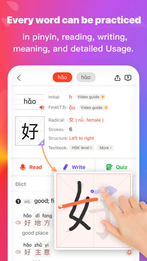 ● Write Chinese characters under the guide of Chinese stroke order and get assessment result of every handwriting stroke, which makes it easier to write Chinese