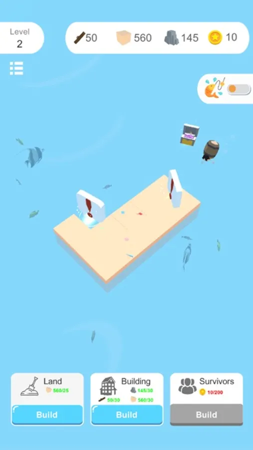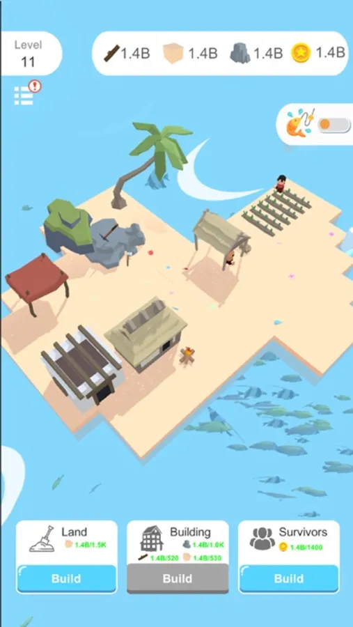 There is only a small beach at the beginning. You need to constantly collect resources, gradually build your island, raise bonfires, build buildings, and finally build a magnificent island.