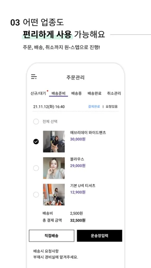 간편한 주문관리로 접수부터 배송 완료까지 한 번에 관리해보세요.