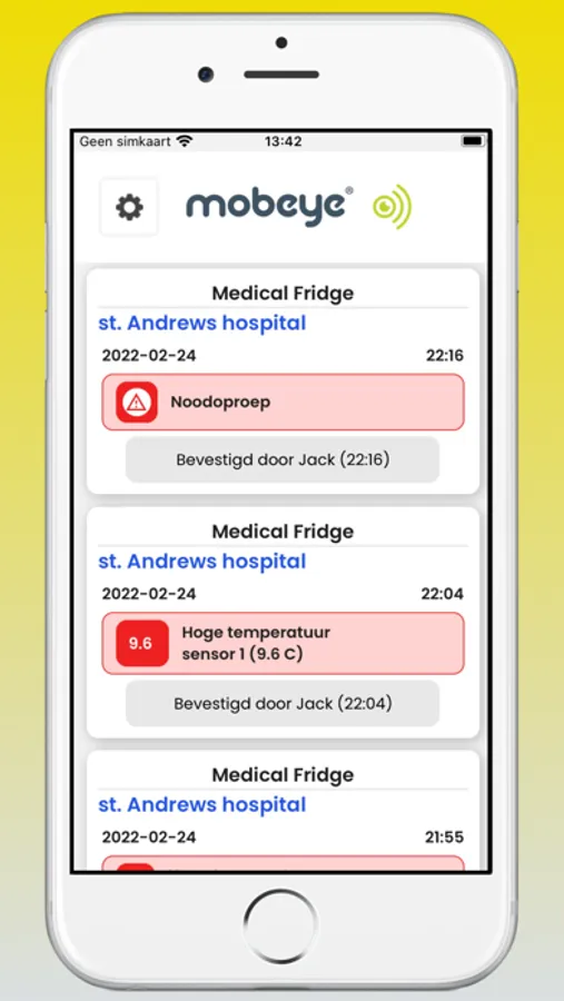 Mobeye devices will send push messages to this App. With a clear alarm sound, you get notified of any critical situation. You are able to confirm these messages so the status is clear for all persons that got the alert.