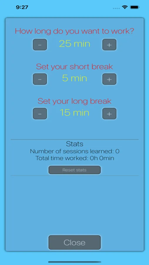 -You can adjust the timer for the study/work time, short break time and long break time.