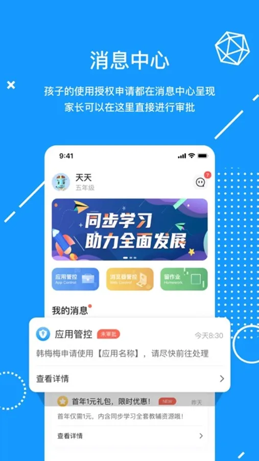 【消息中心】孩子的使用授权申请都在消息中心呈现,家长可以在这里直接进行审批;