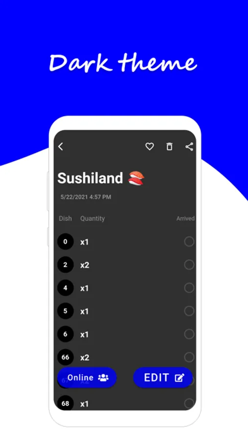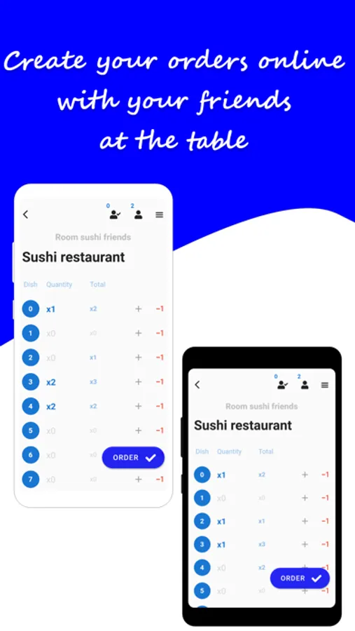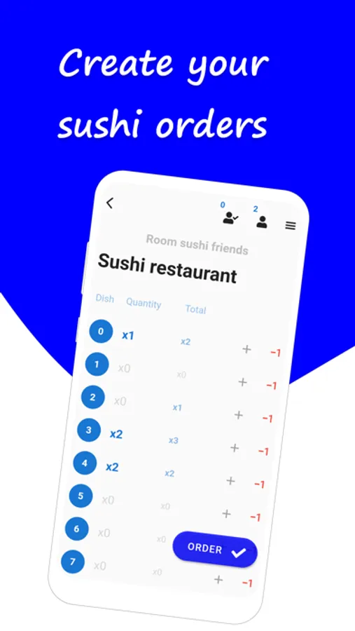 - Online: A virtual room will connect all friends at the table. Everyone will choose their dishes from the menu and Sushi Memo will combine your and your friends' orders and show you the total. Just show the total order to the waiter to order easily.