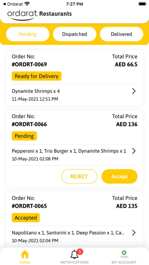 Ordarat restaurant is the app for restaurant owner to track the orders received from customers and for fulfillment. Restaurant owner can login to app using the credentials provided from backend. Once they login they can start getting orders and hence can change the status of each order as per the delivery.
