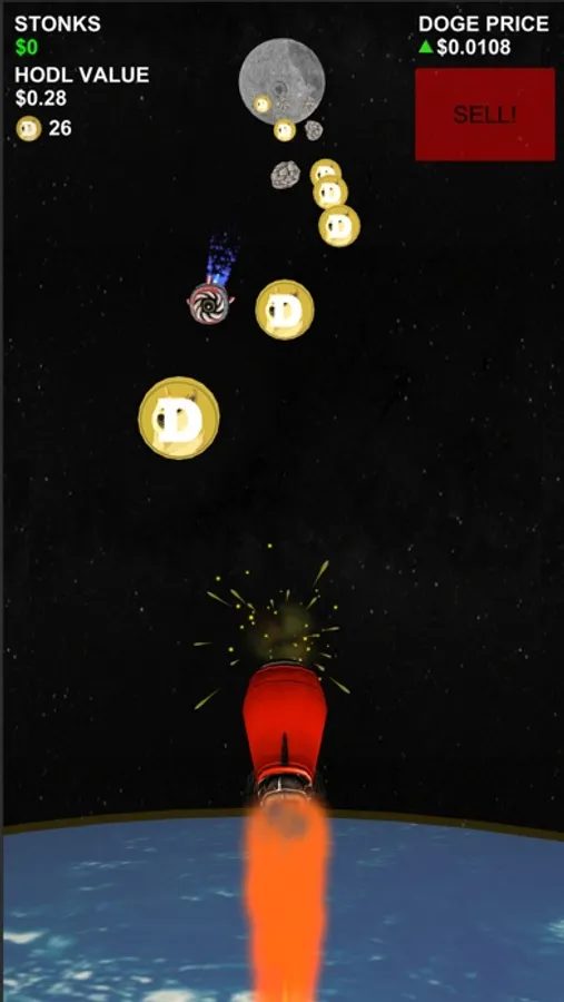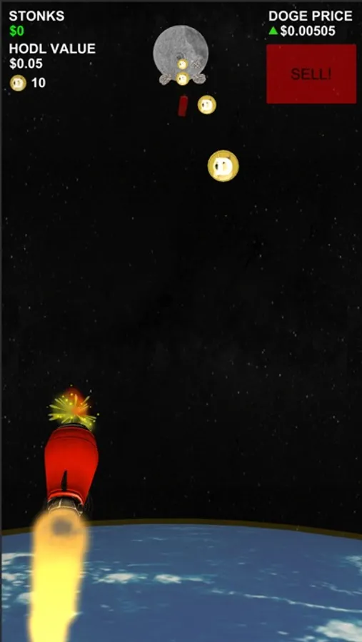 Blast through space in your Doge rocket to the moon! Dodge asteroids and incoming rockets while you collect Dogecoin! Sell your Doge at the right time and secure some profits! #STONKS
