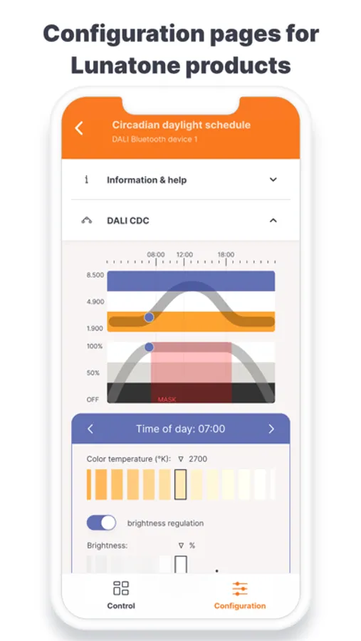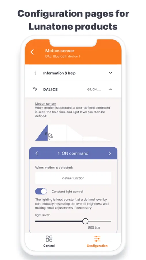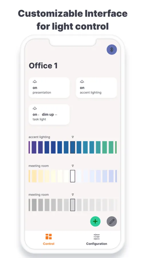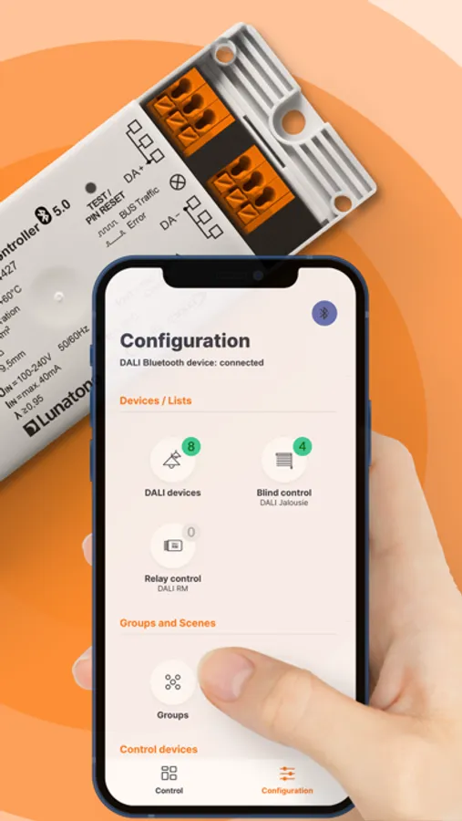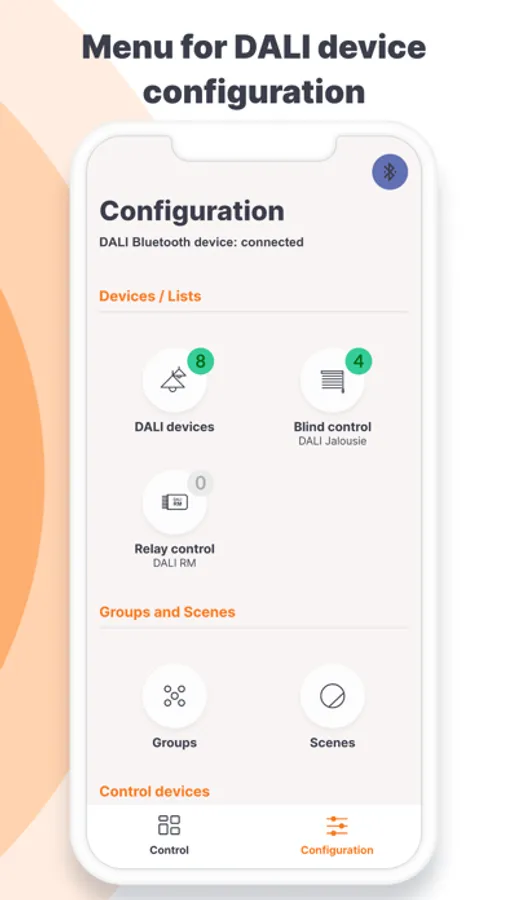 Smartphone application for configuration and control of DALI systems in connection with the DALI-2 BT5 Room Controller.
