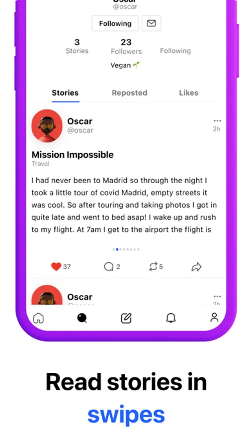 * Swipe-able stories: Too much text on one screen? Don’t worry…You have the option to swipe through a story, allowing you to read one swipe at a time!