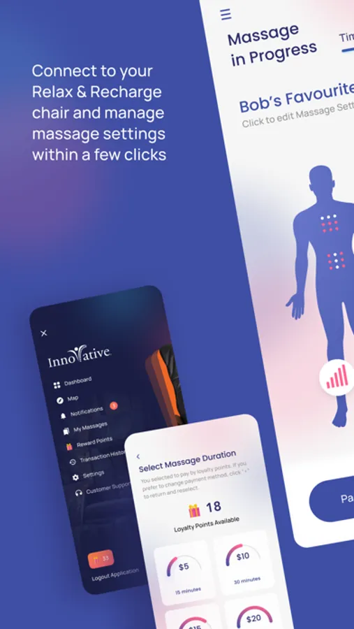 * Connect to a Chair, Customize your Massage, Save to your Profile, Earn 5 points for $1 spent, and Redeem Rewards