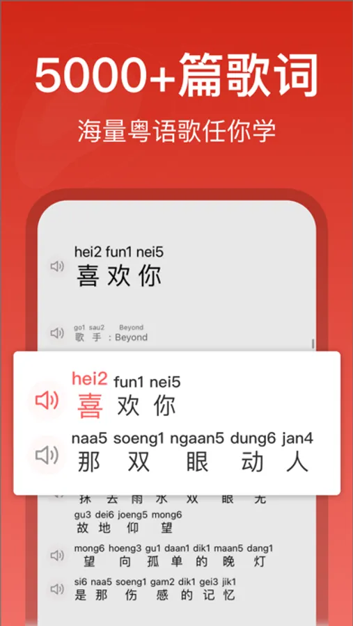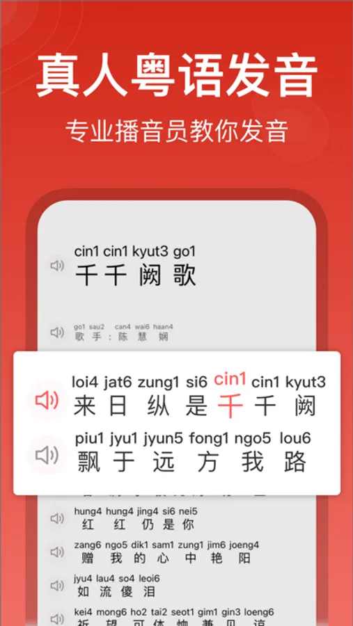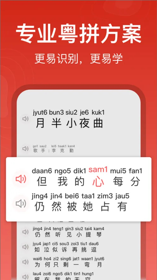 使用专业的粤拼方案、真人粤语发音学唱粤语歌或者学习粤语,能够极大地提高学习粤语和粤语歌的效率,赶快下载使用吧!~