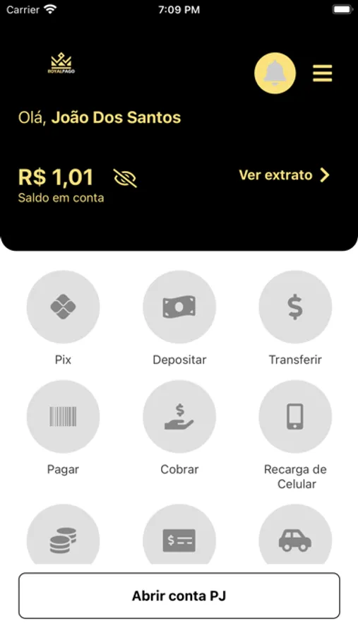 Ao criar a sua conta, você terá acesso a todos os serviços financeiros, tais como extrato, pagar contas, e cobrar alguém.