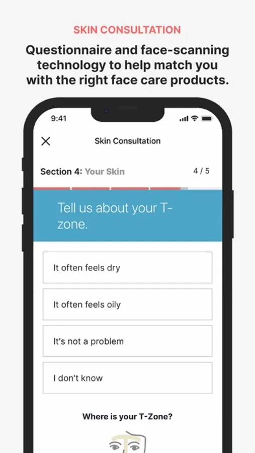 • Skin Consultation—Includes an intelligent questionnaire, optimized mobile face-scanning technology, and an intelligent recommendation engine to help match customers with the right face care products for them.