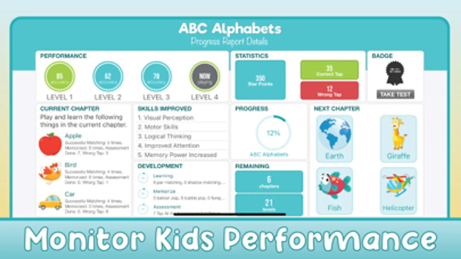 - Pre-made assessment in each level to verify the kids' learning & memorization progress.