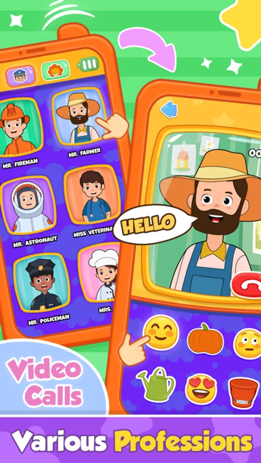 • Phone contacts react to emojis and tools your child hands them. It becomes easier for children to understand emotions, what tools some professions require, and what food animals eat.