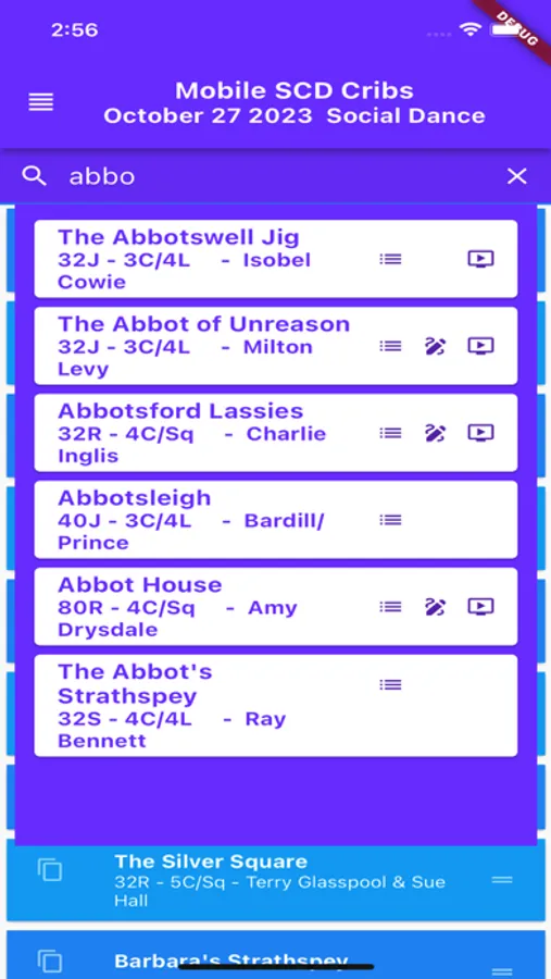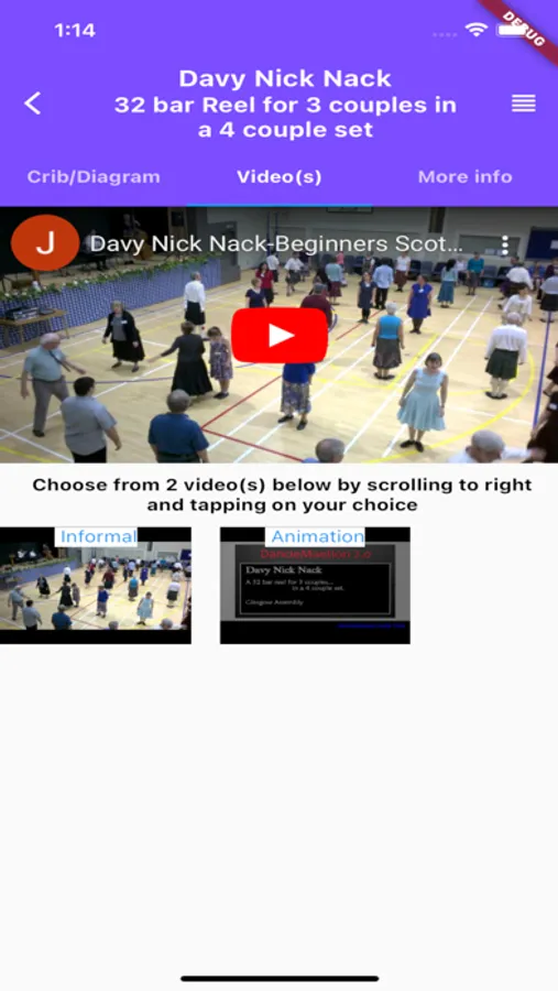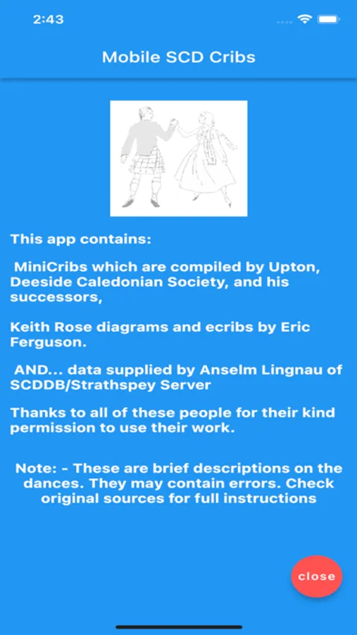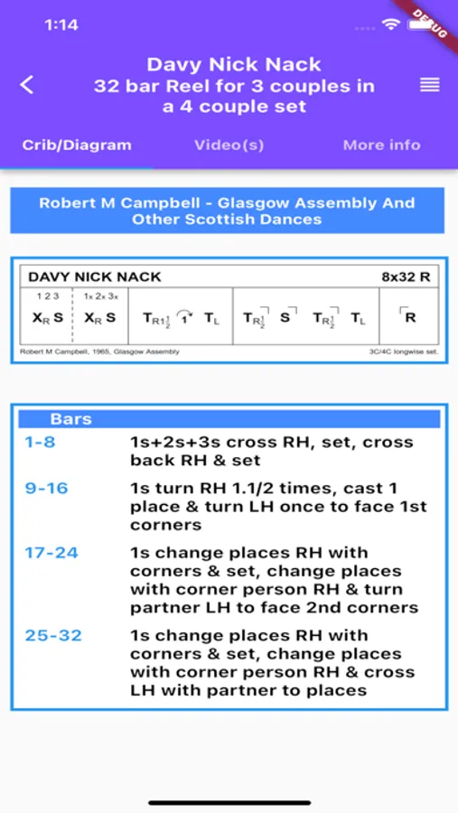 Display crib instructions, Keith Rose diagrams, videos and information/personal notes of each dance on the list. All but the videos will remain available even if your device is offline.