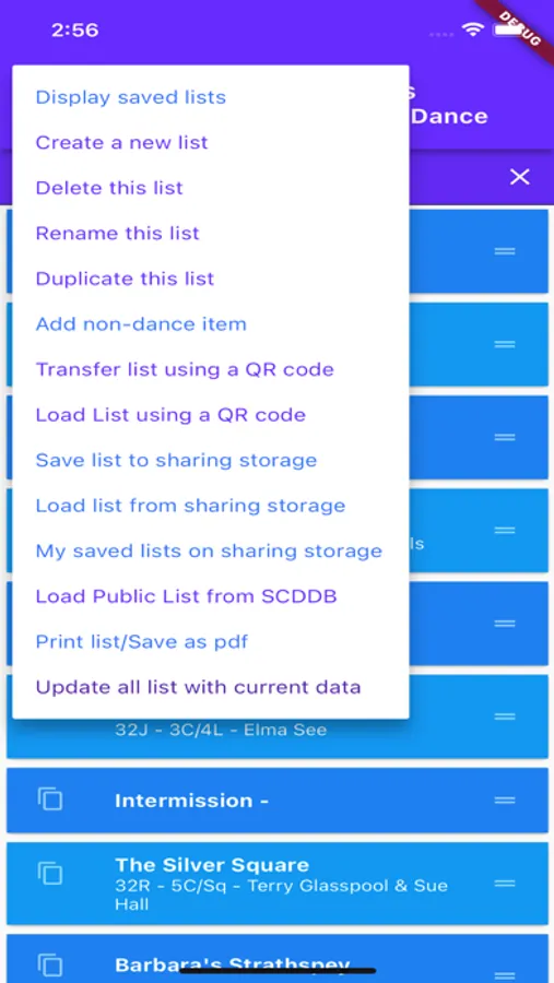 Build a list of dances by entering letters (within the title/deviser name / /dance/publication) in the search area. Tap on that title in the dropdown list and it will be added to your list of dances. The more characters entered in the search, the more refined the search will be. The dropdown list of titles can be scrolled through.