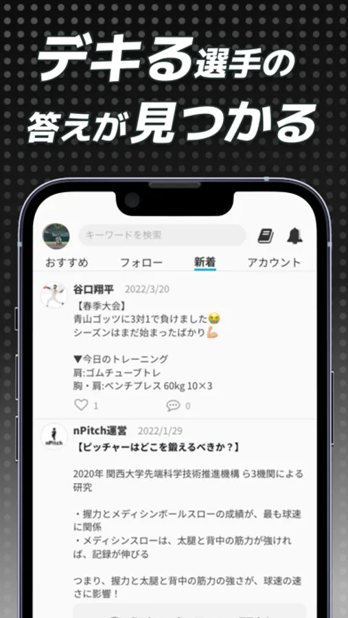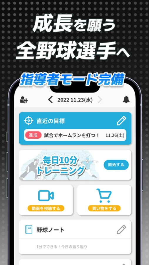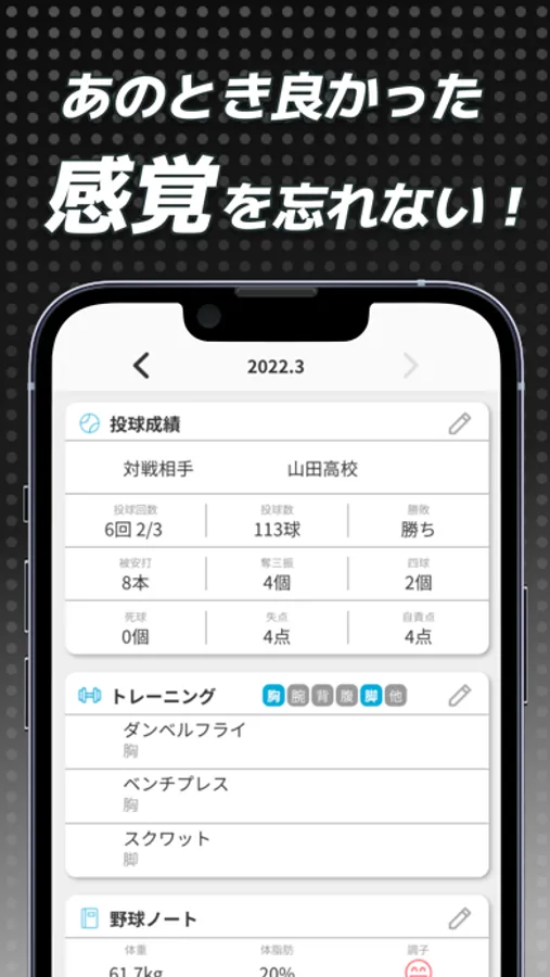 試合・トレーニングの記録や他のユーザーとの交流を通して、野球選手としての成長を促進させます。
