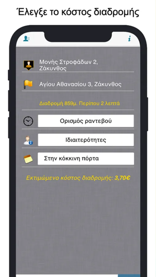 Έχεις την δυνατότητα να αποθηκεύσεις τοποθεσίες, να δεις το ιστορικό σου και να βαθμολογήσεις την διαδικασία εύρεσης ταξί.