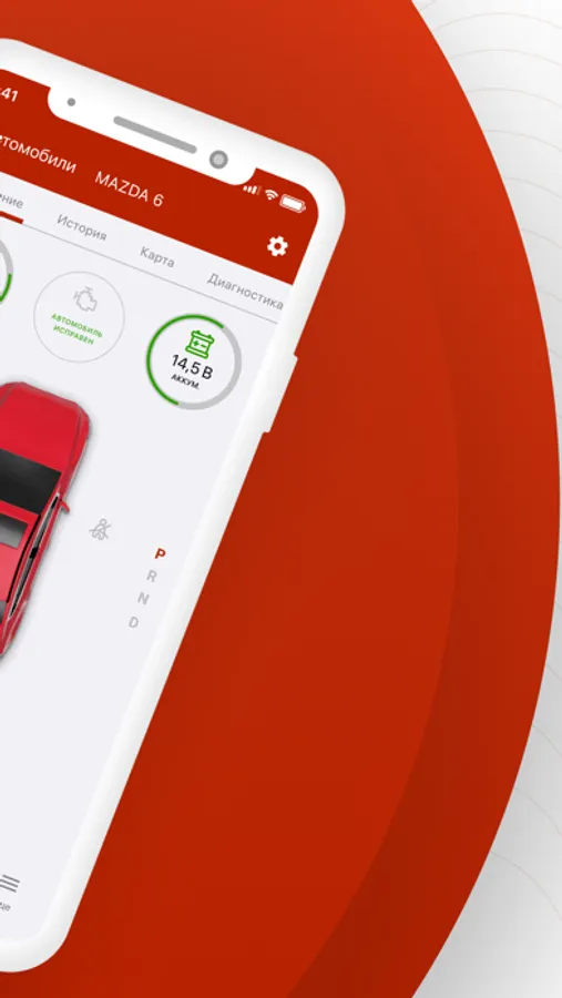 Определение местоположения автомобиля, текущей скорость. Актуальные показатели: топливо, аккумулятор, температура двигателя, ремни безопасности.