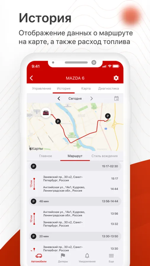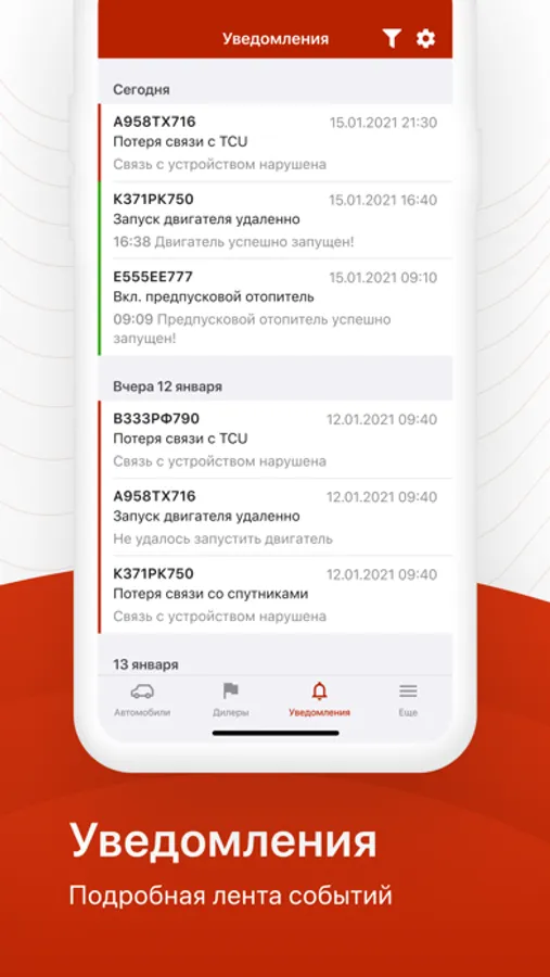 Система уведомлений о событиях: слив и заправка топливом, запуск двигателя с ключа и удаленно, выход и вход в геозону, превышение скорости, потеря связи со спутниками.