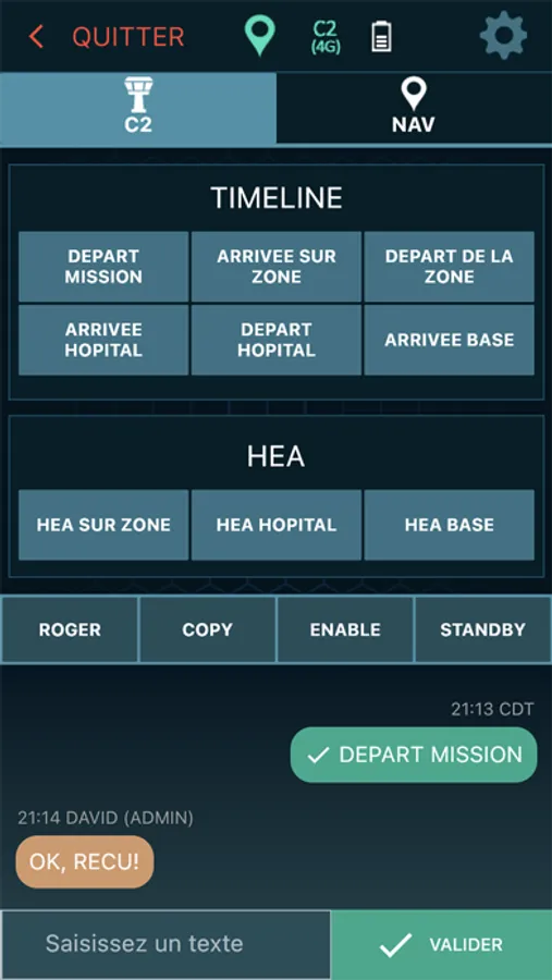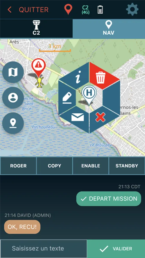 The command center has a global view of all its helicopters, their position, their trajectory, and can communicate with them through a chat window. They can exchange text, images, geographic markers, predefined messages ...