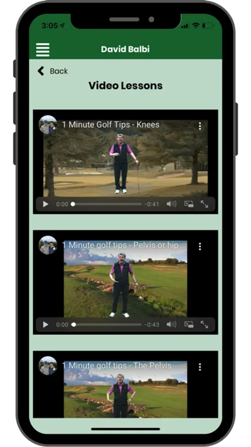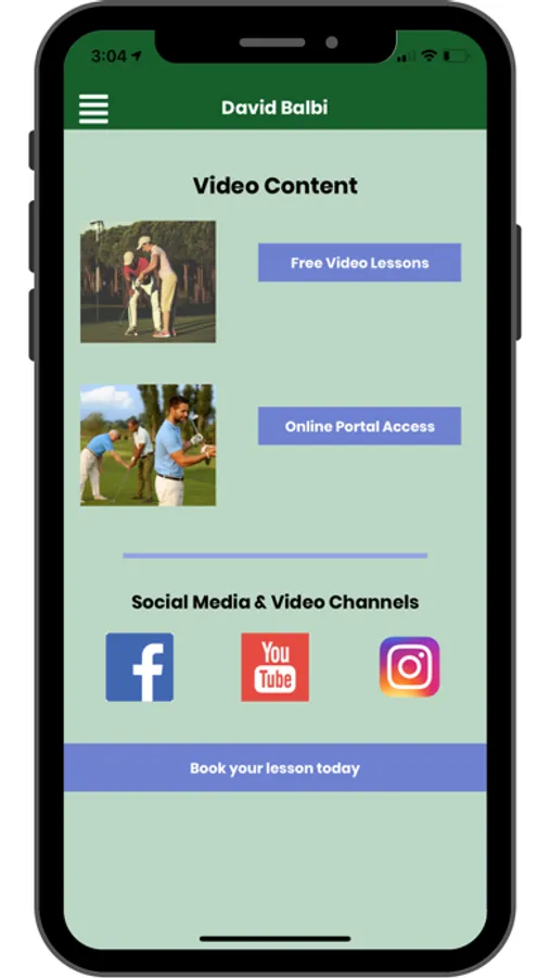 The Golf Pro Guru App is designed to make it easier for golfers and golf instructors to connect and communicate. Golf instructors can showcase their video content and provide quick and easy links to their contact information and scheduling sites. Golfers are able to get an "upfront" insight into the instructor's personality and teaching style and can easily connect with the instructor to schedule lessons. Many instructors have online lesson scheduling systems that can be accessed directly from the App.