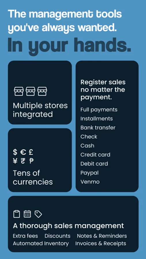 • INTEGRATED STORES: Create all your stores, no matter if it is one or several, it will be easy to manage. Switch between them very easily, one touch and you will see everything from another store. Now you can have an eagle view of your business!
