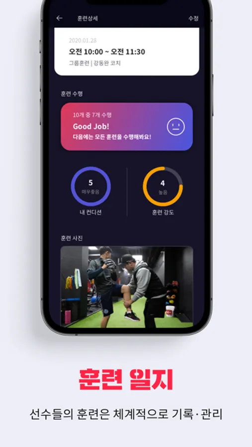 - 훈련 배정, 훈련 확인, 훈련 영상/설명 글 확인하기, 훈련/경기일지 작성 등이 가능합니다.