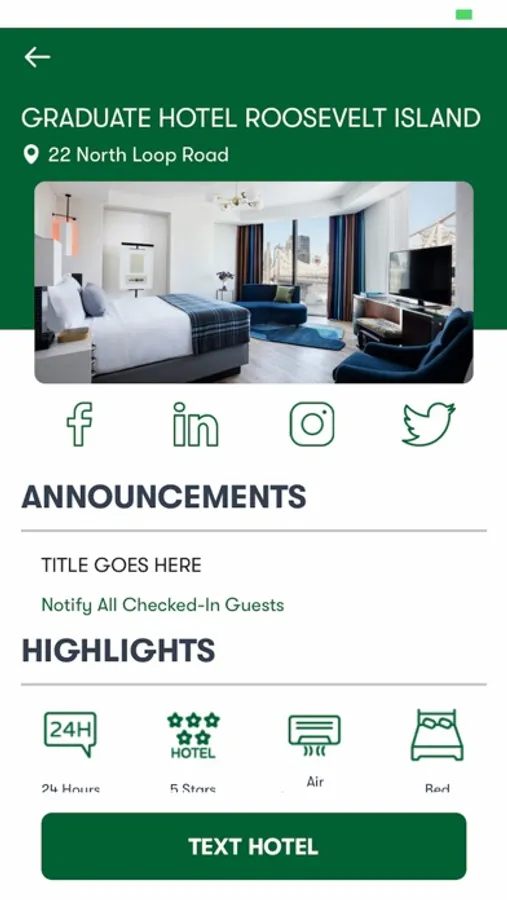 * “Front desk help” at your fingertip built right into the app. No more hunting for phone numbers in dresser, drawers, etc.