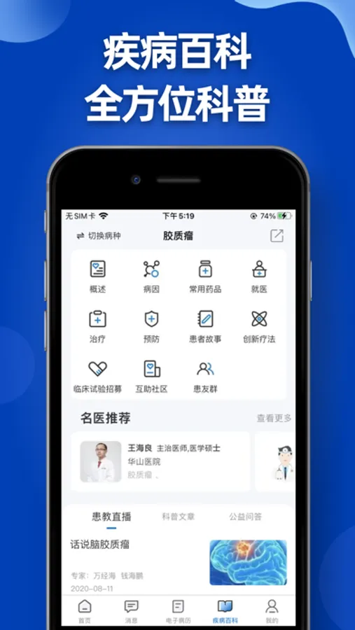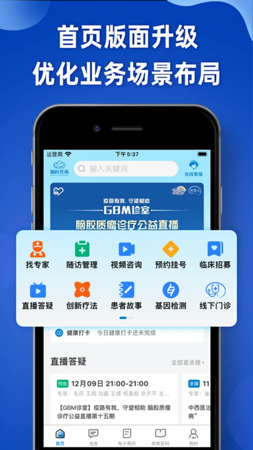 《脑医咨询》是一款致力于搭建脑外科和脊髓脊柱医患在线交流的平台,平台包括临床试验招募、咨询大厅、图文咨询、团队咨询、随访管理、预约加号、健康知识、病历卡等八大板块,涵括患者从术前到术后康复全周期服务。