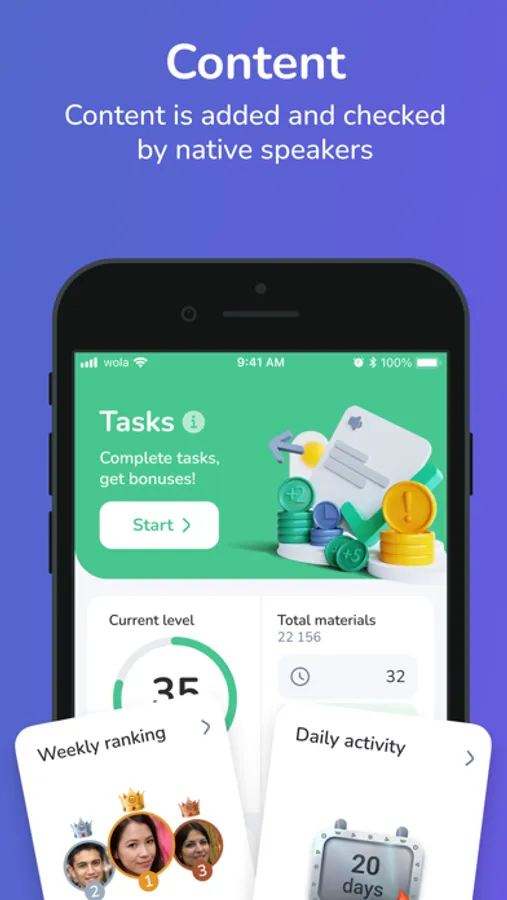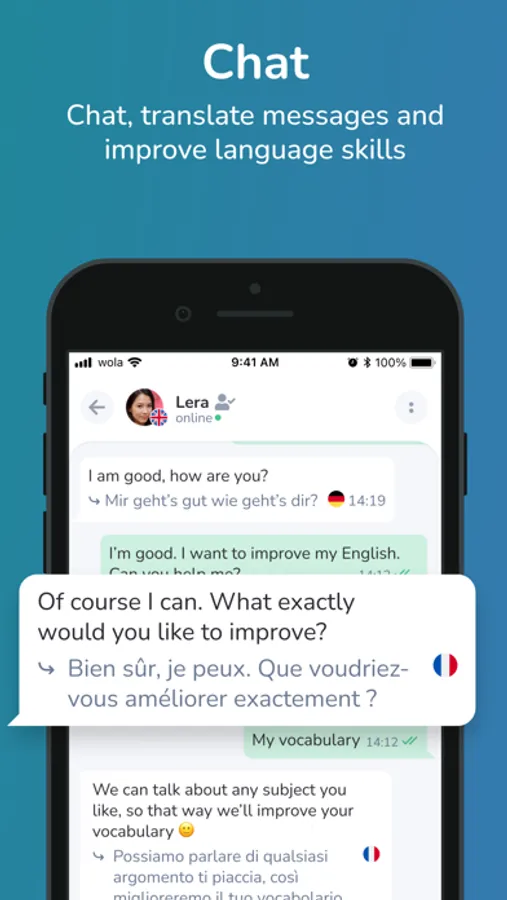 Chat with native speakers and translate their messages into your native language. Correct your messages in case of errors or typos