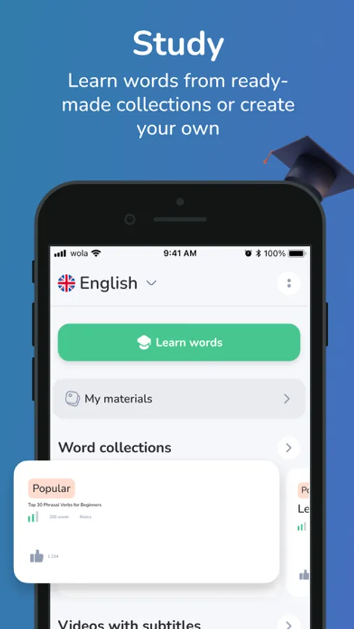 Learn new words with collections and subtitled videos on different topics and difficulty levels