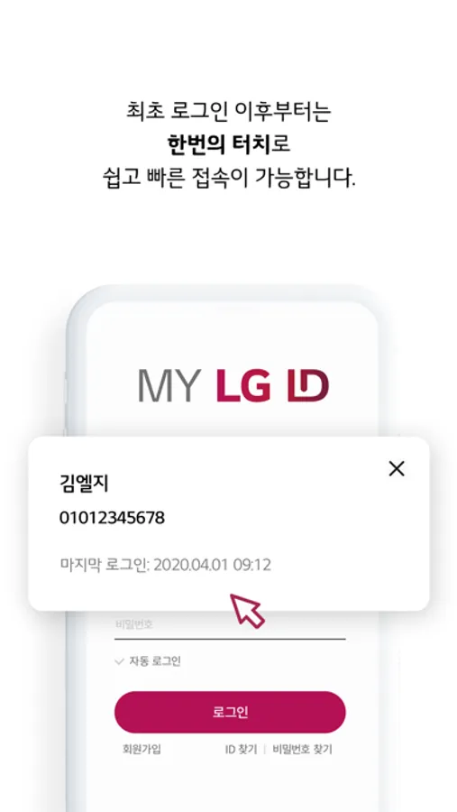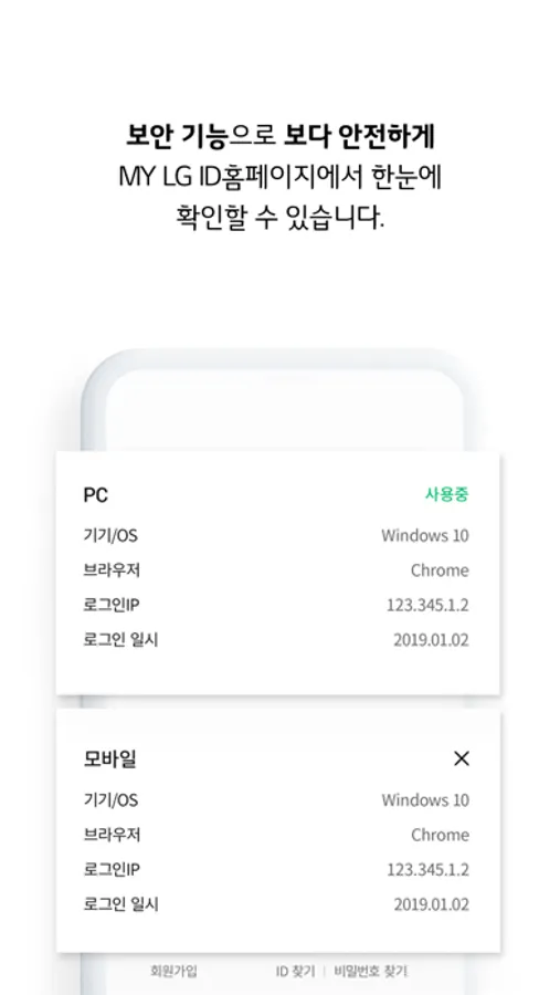 MY LG ID의 보안 기능으로 개인정보 걱정 없이 LG 서비스를 더 안전하게 이용할 수 있습니다.