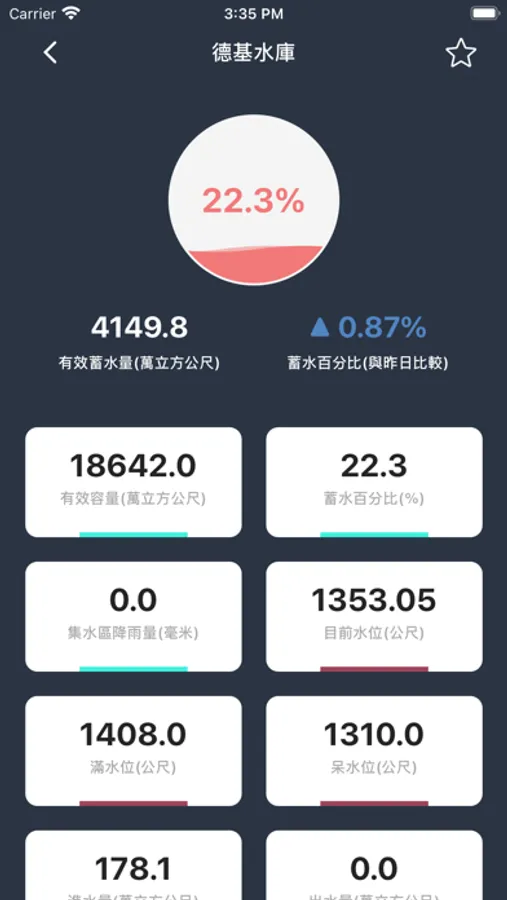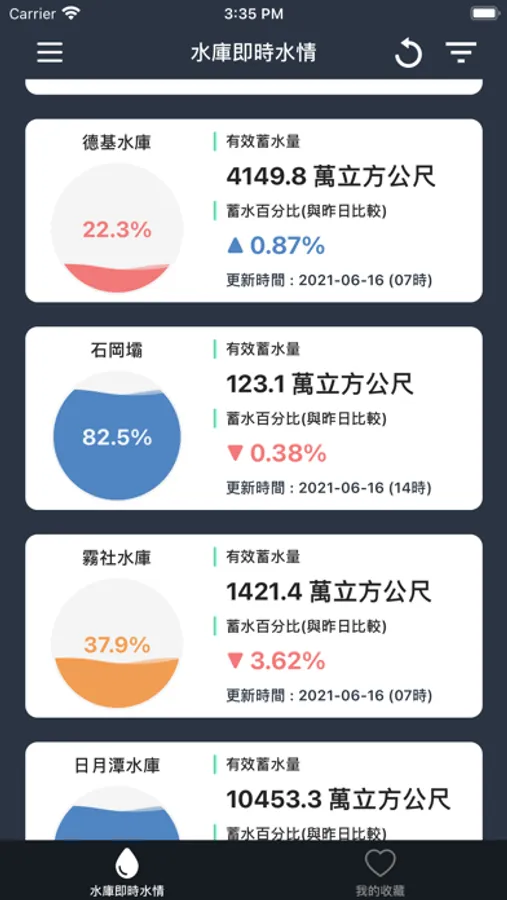 •「水庫水情」可以提供民眾關於台灣水庫的即時資訊,簡潔乾淨的操作介面讓使用者一目了然。