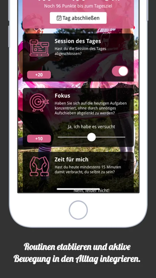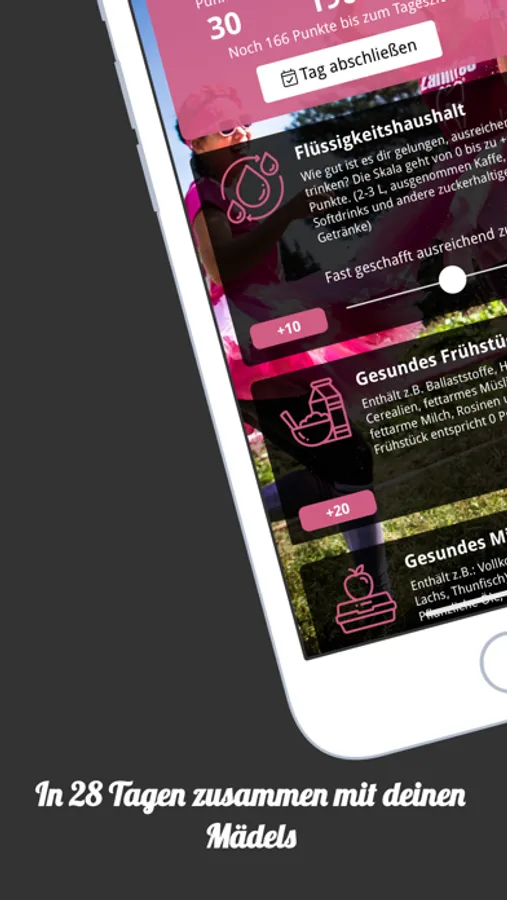 Nutze die App, um an dem 28-tägigen Muddy Angel Mädelstrip teilzunehmen, täglich gesunde Punkte zu sammeln und so deinen Lebensstil nachhaltig zu verbessern. Vorab musst du dich über unsere Website muddyangel.7peaks.app registriert haben. Mit der App hast du deine Verhaltensweisen und deinen persönlichen Fortschritt stets im Blick. Über Chat- und Postfunktionen tauscht du dich mit deinen Mädels aus - gegenseitig motiviert ihr euch und verbringt gemeinsam eine unvergessliche Zeit.