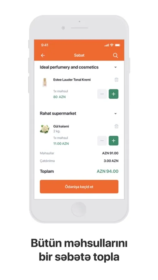Qida, içki, geyim, ev əşyaları kimi fərqli kateqoriyalara aid olan məhsulları onlayn multisəbətinizə əlavə edin, biz isə sifarişinizi sərfəli qiymətə ən qısa müddət ərzində çatdıraq. Çatdırılma prosesini mümkün qədər tez etmək üçün seçdiyiniz mağazaya ən yaxın kuriyer təyin olunur və məhsulunuz qeyd etdiyiniz ünvana göndərilir.