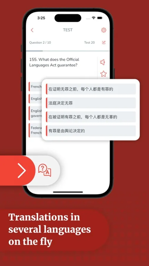 Our app offers audio and content in Canada's official languages, so you can study for the test in English or French.