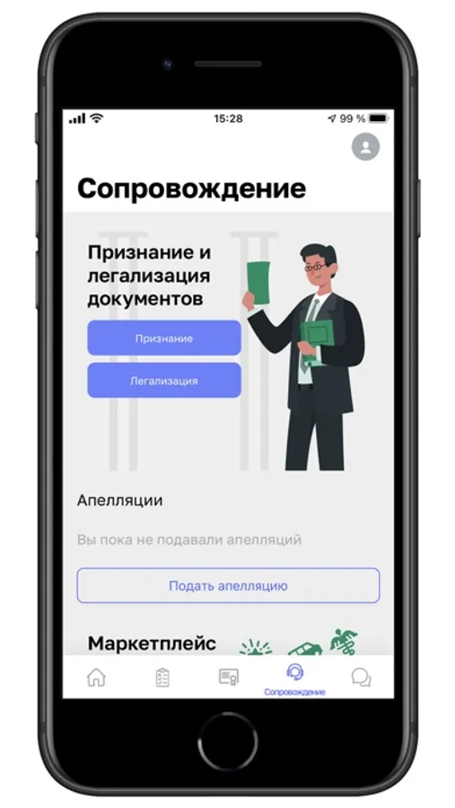Позволяет полностью пройти процесс подачи заявления на мобильном устройстве, отслеживать статус его изменения и обращаться за поддержкой к компетентным сотрудникам.