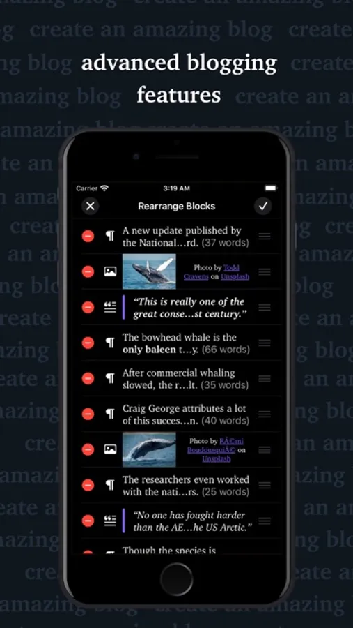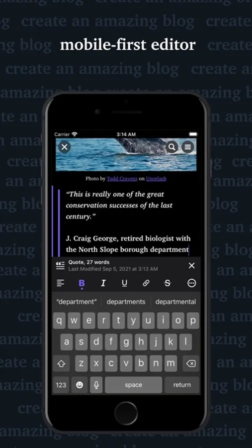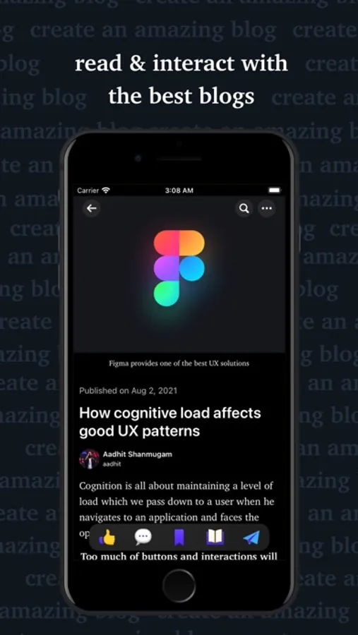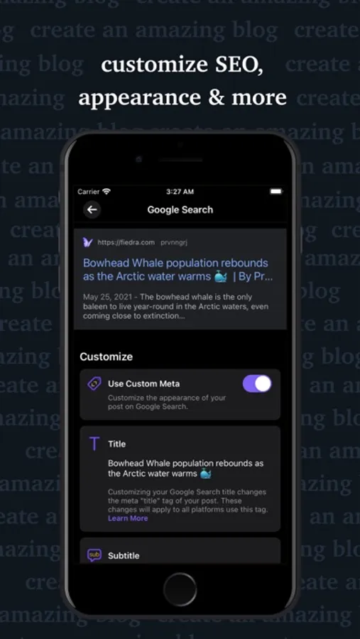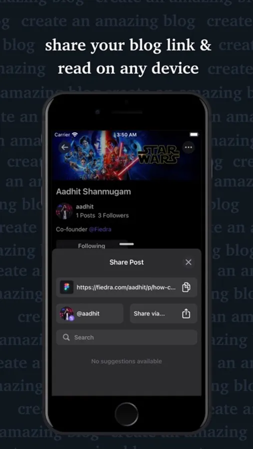 Use the native editor in the app to create your blog. Customize every aspect of your blog, including the meta tags, design, and more! Once you are done publishing, share the link to your post with your friends.