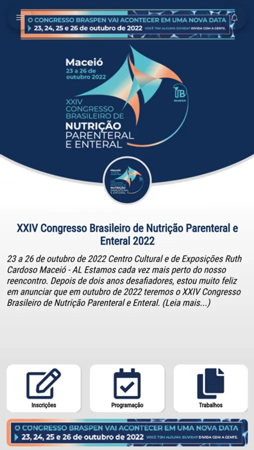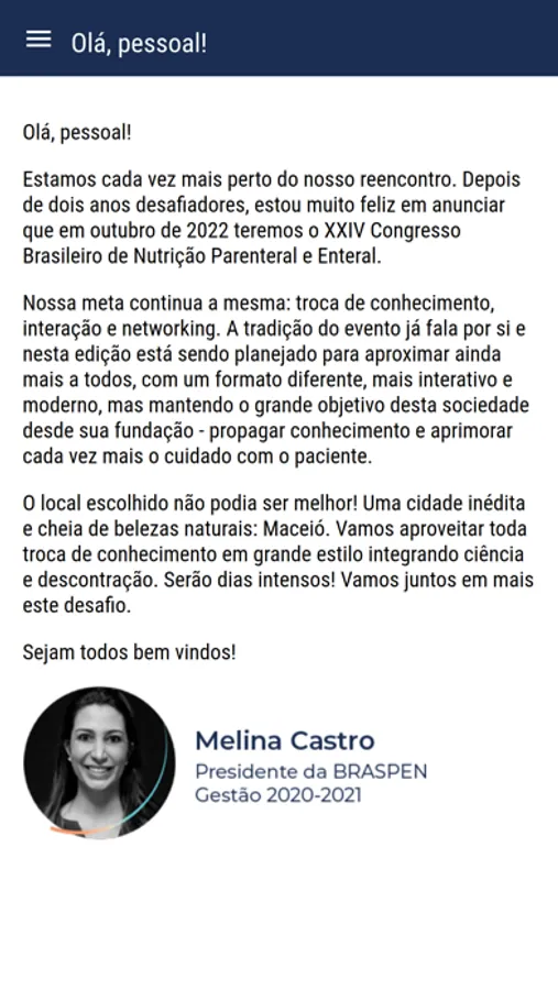 Estamos cada vez mais perto do nosso reencontro. Depois de dois anos desafiadores, estou muito feliz em anunciar que em outubro de 2022 teremos o XXIV Congresso Brasileiro de Nutrição Parenteral e Enteral.