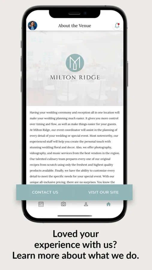Learn More About Milton Ridge: Love what we do? Tap the home icon in the app to learn more and contact us for details about hosting your next event.
