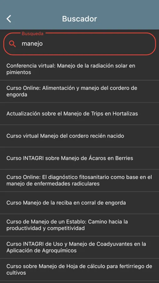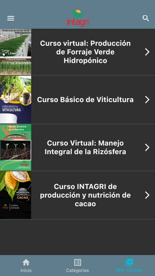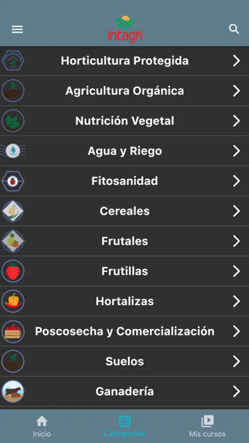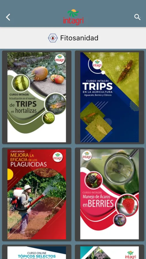 Cursos virtuales agrícolas: horticultura protegida, agricultura orgánica, nutrición y fisiología vegetal, microbiología, manejo del agua y del riego, fertirrigación, fitosanidad (plagas y enfermedades), postcosecha y comercialización de cereales, frutales, berries y hortalizas.