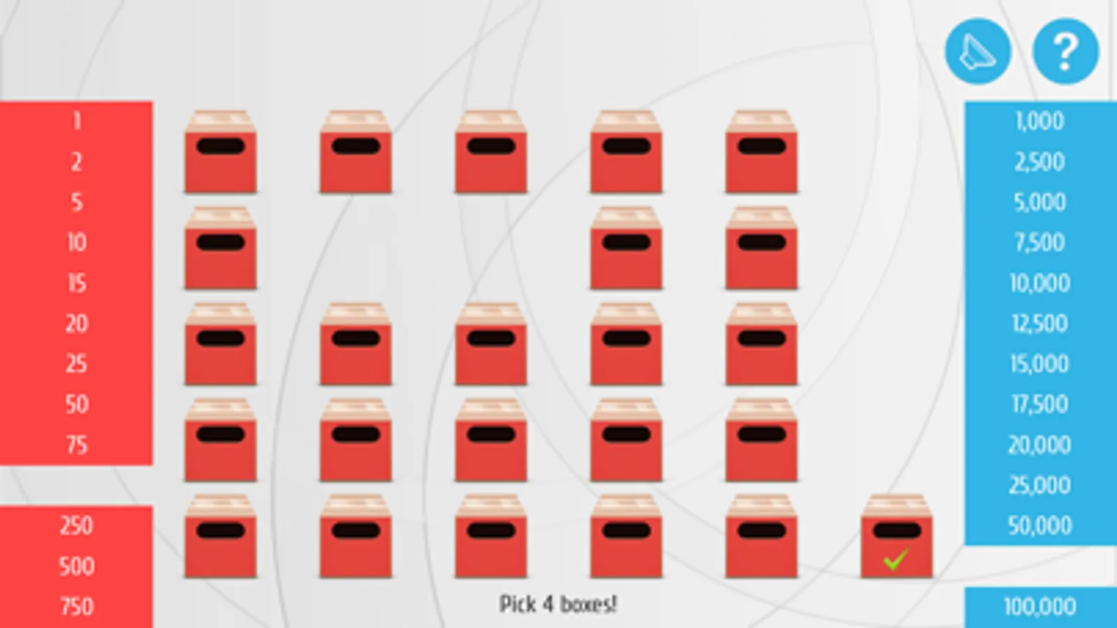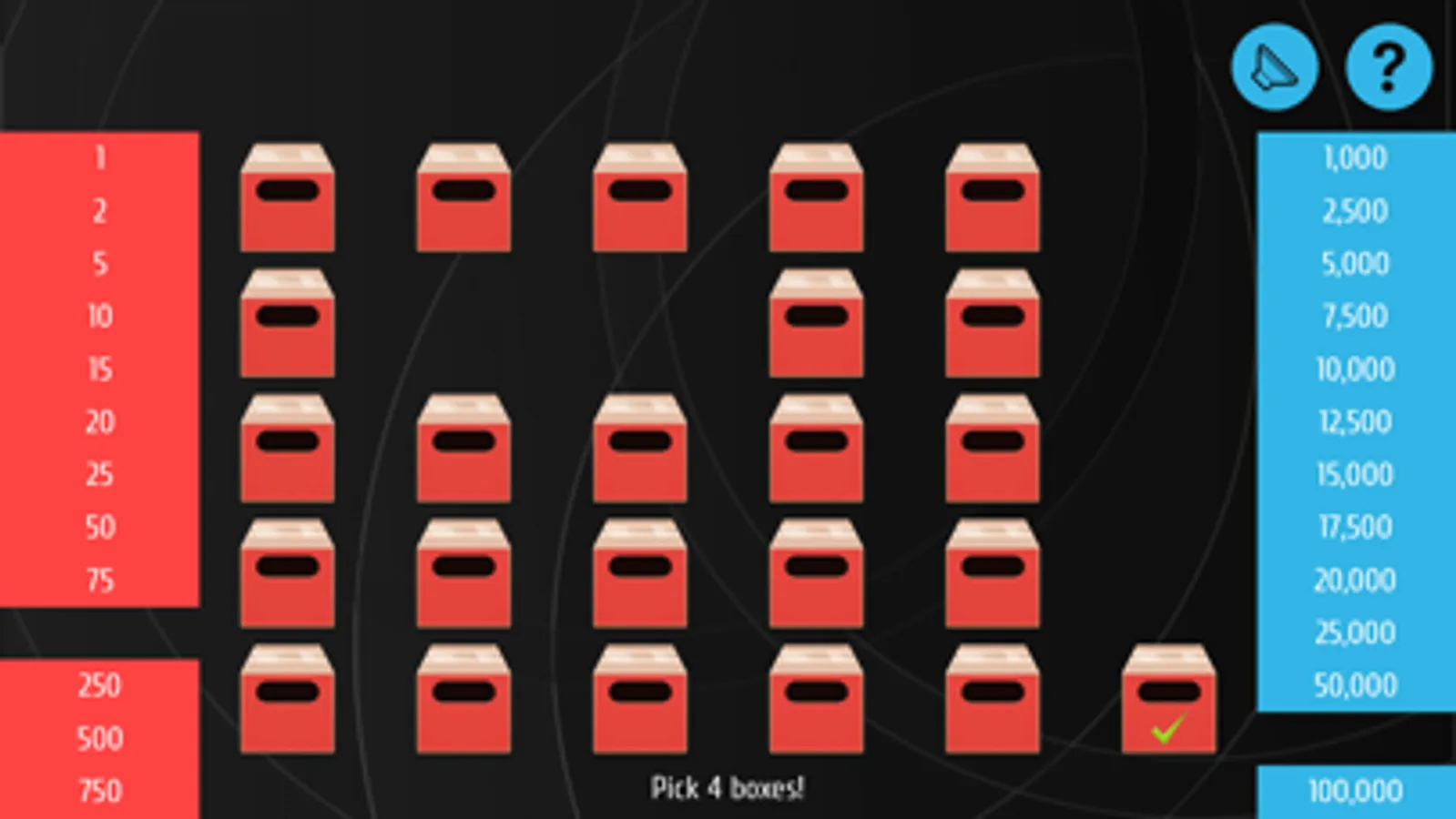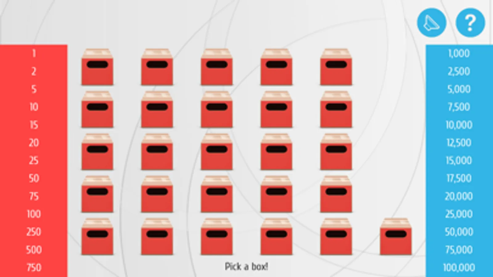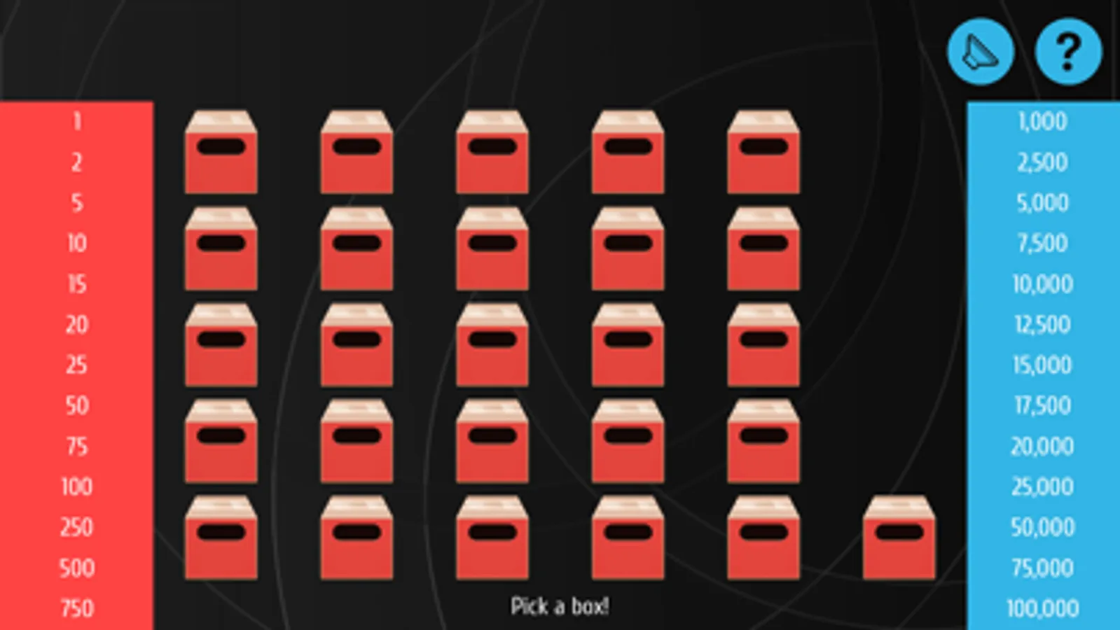 At the start of the game you pick one of the boxes. Then you open boxes one by one. In different situations you will get an offer. If you agree you will get the offer and end the game. Sometimes your offer will be box exchange. If so you can swap your box with another one. If not you will continue your game. If you open all of the boxes and don't agree to a deal you will win the content of your box.