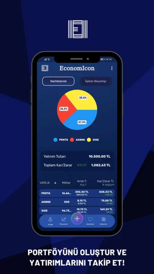 Portföyünü hemen oluştur ve yatırımlarını özgürce takip et! İstediğin yatırım aracını portföyüne ekleyebilir ve işlemlerini takip edebilirsin. Diğer porföylerin aksine EconomIcon portföyünde sahip olduğun hisse senetlerini portföyüne ekleyebilirken kripto para, altın ve döviz varlıklarını da portföyüne ekleyerek bütün sahip olduğun varlıkları tek bir ekranda görebilir ve bu varlıkların hemn teker teker hemde toplamda kar/zarar durumlarını takip edebilirsin.